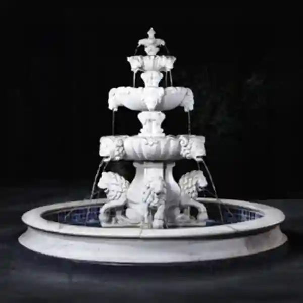 - Large-scale designs featuring fully sculpted lion statues guarding the fountain base.