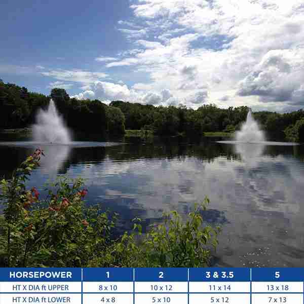 Our AquaMaster Baytree Lake Fountain is a classic narrow two-tier pattern consisting of a center geyser with a lower tiered crown. Add this fountain to you water gardens, large fish pond or small lakes to create a beautiful landscape.