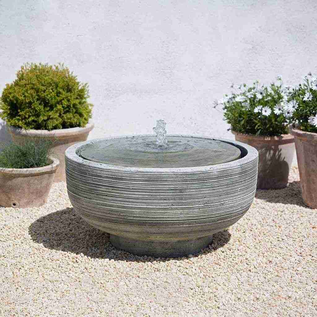 The Girona Fountain features a low profile bowl with a textured, ribbed sidewall. Water gently bubbles from the copper spout and spills evenly over the top “plate” of the fountain. This plate is slightly smaller than the bowl opening, leaving a small gap for the water to spill down into the main bowl area.This unique design creates a very unique tone and cadence to the fountains sound. A melodic sound that soothes the senses and enhances the ambiance of any setting.