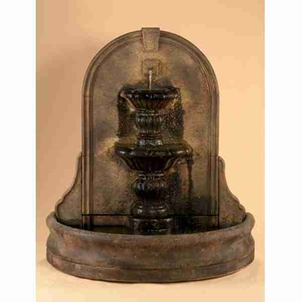 The fountain showcases a simple arched wall design with a spout at the top, allowing water to cascade down through relief tiers into a round basin below. This design not only provides visual appeal but also creates soothing water sounds, enhancing the ambiance of your outdoor space.