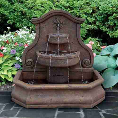 Design: The fountain features an arched backplate with intricate detailing, complemented by a scalloped basin that gracefully collects the cascading water. This design brings a touch of classical sophistication to gardens, patios, or courtyards. Water flows from the fleur de lis design and into two channeled tiers before flowing into the basin below. This fountain’s classic design and soothing water flow make it a timeless addition to any outdoor