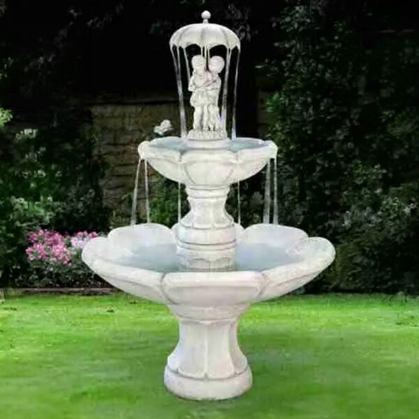 This impressive piece features a couple of children caught in a rainstorm with their puppy. They stand atop a channeled tier as rain cascades over their umbrella, flowing through the tier and into the lowest level.