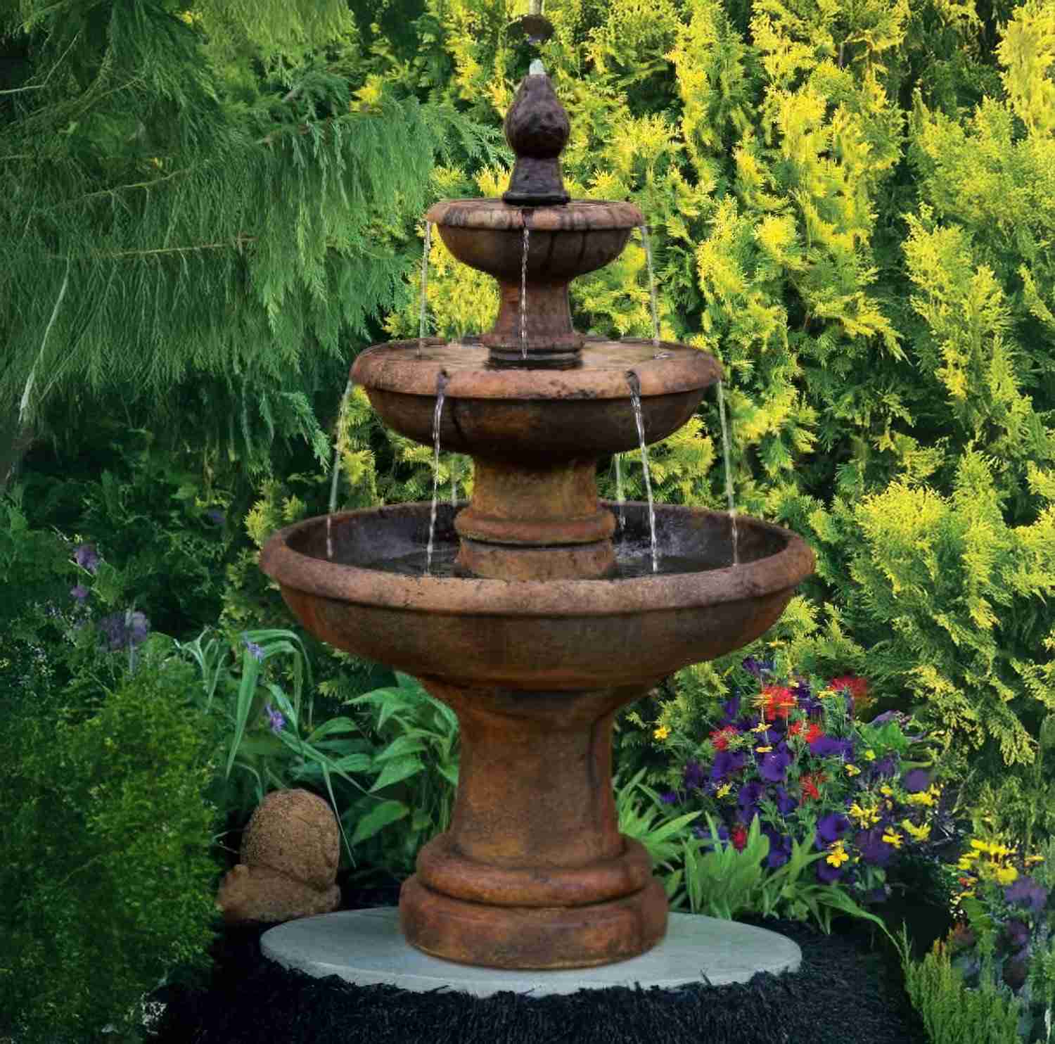 Water flows from the top tier down through each sculpted level, creating a gentle, rhythmic cascade that adds movement and calm to your outdoor space. -