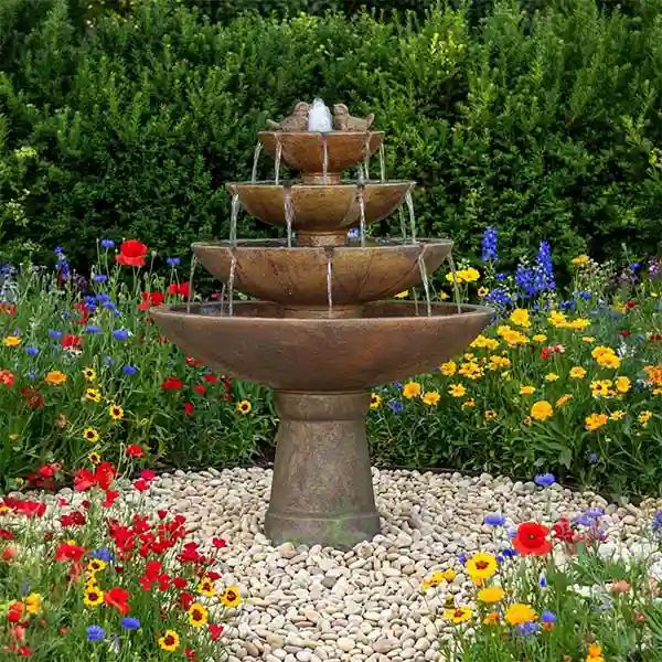 Design: The fountain features a tiered bowl structure with water gracefully spilling from one level to the next. Two sculpted birds perched on the upper tier add a touch of nature and charm, creating a tranquil atmosphere. The water flow on this fountain is very full creating a great visual appearance and relaxing sound. The bowls of this fountain have a classic styling yet a flare of moders in their design as well. This is part of our Proven Winner series having proven itself as an excellent choice for hundreds of customers over the years.