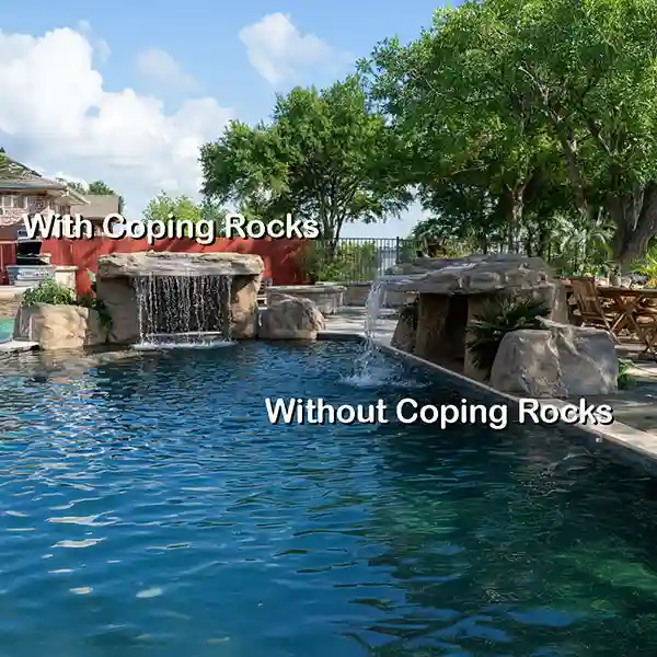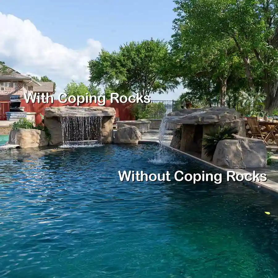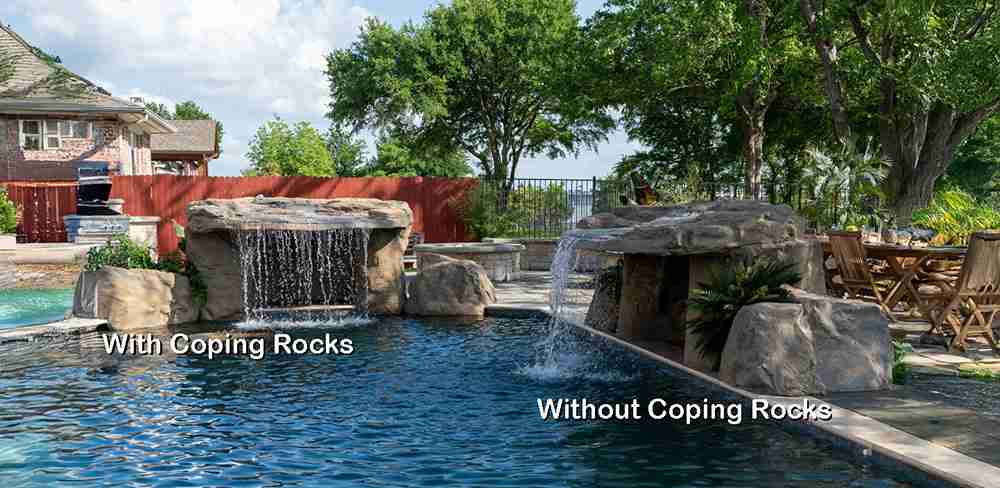 Sunset Grove Grotto Waterfall with coping edge that extends into the pool This swimming pool waterfall comes in ONE piece. Plus 2 x side rocks and you can choose to add coping edge rock pieces that allow the edge rocks to extend down into the water for a more realistic look and feel.