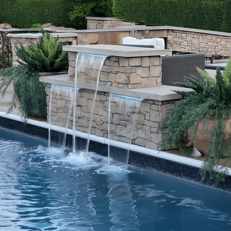 The Victoria Falls 6 FT Plus 3 FT Complete Swimming Pool Waterfall Kit by Universal Rocks Waterfalls comes in two heights of falling water this 6 + 3 is 6 feet long on the bottom and 3 feet long on the second level, and is a perfect accent to any pool. Elevate your pool experience with the Formal Pool Waterfall. This stunning accessory brings a touch of luxury to any backyard setting, turning your pool into a mesmerizing focal point.